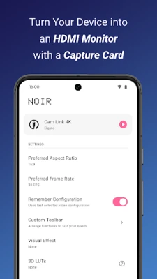 Noir supports UVC video streaming and UAC audio streaming, offering a choice between OpenGL ES and Vulkan for the graphics backend.